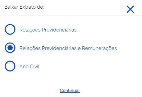 Ao clicar em Baixar PDF, selecione a opção Relações Previdenciárias e Remunerações e em seguida, clique em Continuar.